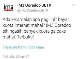 “Ada keramaian apa pagi ini? Bayar kuota internet mahal? IM3 Ooredoo sih ngasih banyak kuota gak pake mahal. Terbukti!,” ujar tweet akun @IM3OoredooJBTK. Meski tak disebutkan, kita pun pasti sudah paham maksud dari tweet Indosat ini untuk menyindir provider Telkomsel yang terkenal mahal.