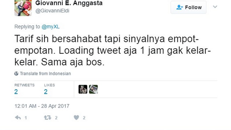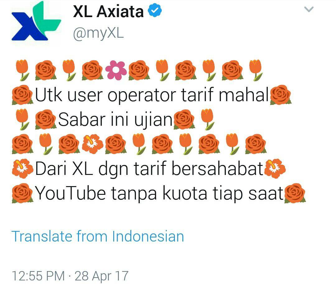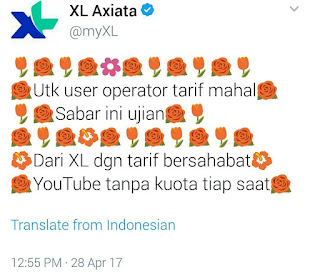 XL Axiata pun tak mau kalah untuk mengambil kesempatan emas di tengah kemalangan lawannya itu. “Utk user operator tarif mahal, sabar ini ujian. Dari XL dengan tarif bersahabat. YouTube tanpa kuota tiap saat,” tweet aku @myxl.