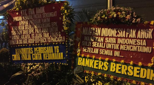 "Untuk rasa sakit yang kau terima, bapak Ahok martir buat kota ini. Jangan pernah patah semangat apa pun putusan hakim," tulis salah satu karangan bunga tanpa nama pengirimnya.